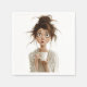 La imagen representa un caprichoso y exagerado ilustracion al estilo personalizado de una mujer con ojos amplios, sobresaltados, cabello melindroso en un moño desordenado y pecas. Parece deslucida y confusa, sosteniendo una taza de café blanca en ambas manos mientras usa una bata ligera con un patrón floral. Su expresión sugiere que está sorprendida o abrumada, posiblemente después de despertarse o de experimentar un momento caótico. Los rasgos exagerados, especialmente sus ojos grandes y su cara delgada y expresiva, le dan un tono humorístico y afectuoso a la escena.
