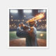 Un hombre graduado con una gorra negra y un vestido de bata listo para golpear una bola en llamas con un murciélago con fuego bajo luces de estadio brillantes