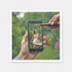 Una mano vierte vino tinto de una botella en un vaso perfectamente alineado con la pantalla del celular mientras una mujer sentada en un jardín observa creando una intrigante mezcla visual de lo digital y la realidad.