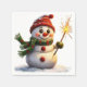 Un muñeco de nieve festivo adornado con un sombrero rojo y bufanda durante un invierno nevado.