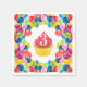 Un ilustracion alegre y festivo de globos de colores variados que enmarcan los bordes de esta servilleta y un quequito con crema rosa y un armario amarillo. Hay un número blanco en la guinda para el niño de cumpleaños o la edad de los chicas.