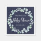 Una moderna servilleta de ducha para bebés a juego con nuestro equipo de invitación, con fondo marino, eucaliptos de color azul verde y verde, y texto blanco en letra sans serif y con letras a mano. Personalice su nombre y fecha de ducha.