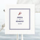 Las servilletas de boda de langosta roja con nombres de novias y bodas se encuentran dentro de un borde doble. Blanco con texto azul marino en bloques y guiones, encabezado de langosta marrón y borde azul marino sobre un fondo blanco.