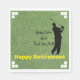 Un diseño divertido para tu golfista favorito. El fondo tiene el aspecto de un campo de golf, con una silueta de golfista. El texto del guión decía: "Mantén la calma y cierra el Putt". En la parte inferior, el texto dice "Feliz Jubilación". Se puede personalizar todo el texto.