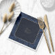 Elegantes servilletas de bodas de estilo más formal, con un diseño clásico de marcos dorados y texto con un borde paisajista ornamentado con un brillante azul marino. Añade tus nombres en esta hermosa letra de guión y fecha de boda en un serif clásico con su atractivo tradicional. Busque ID767 para ver otras opciones de color para este diseño.