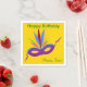 Máscara morada de bonito con plumas coloreadas rosadas, verdes, amarillas, azules y rojas con un aspecto de purpurina. Se muestra en un fondo amarillo dorado. Perfecto para fiestas de cumpleaños, dulce 16, baile de máscaras, festividades del Mardi Gras. Personaliza para tu ocasión especial. Divertidas servilletas de papel desechables de un solo cumpleaños para los huéspedes fiestas. Obra gráfica original de TamiraZDesigns. Visita mi tienda para más artículos originales: www.zazzle.com/tamirazdesigns
