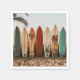 Toallas de fiesta de papel con imágenes de tablas de surf en la playa.