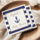 This nautical baby shower napkin features a navy blue anchor in a faux gold-bordered rectangle on a background of navy blue and white stripes. Within the rectangle, the name of the mom-to-be and the words "Baby Shower" appear in faux gold cursive script typography. Ideal for a boy's baby shower. The text is completely customizable. See our collections for matching baby shower supplies.