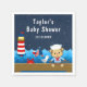 Esta servilleta es bonita y divertida y cuenta con un mono de marinero varón en una cubierta de madera con gaviota y cangrejo. Al fondo, un faro rojo y blanco, un bonito pájaro en un velero, olas del océano y un cielo estrellado azul marino. El texto combina fuentes audaces y serif para un estilo elegante y moderno. Es ideal para una ducha de natación con temática náutica.