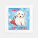 Celebra la temporada de fiestas con un lindo cachorro de Bichon Frise sentado en un sombrero de Santa en medio de copos de nieve y las palabras, ¡Feliz Amanecer!