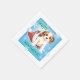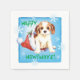 Celebra la temporada navideña con un lindo cachorro Cavalier del rey Charles Spaniel sentado en un sombrero de Santa en medio de copos de nieve y las palabras: ¡Feliz Amanecer!