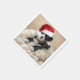 Un cachorro pequeño, negro y blanco se esconde cómodamente sobre una manta y almohada de color crema con un gorra de Santa Claus