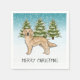 El personalizado original de Destei ilustracion de un lindo abrigo amarillo color perro de raza Golden Retriever. El perro es colocado en una escena invernal con tres abetos verdes y la caída de la nieve. El fondo es un degradado de azul a blanco que da al diseño ese aspecto frío del invierno. También hay un área de texto personalizable que ahora dice: "¡Feliz Navidad!".