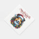 Una servilleta de papel festivo con un perro alegre que usa un sombrero de Santa o canas de reno, rodeada de decoraciones navideñas como regalos y copos de nieve, que le dan un toque alegre y reconfortante a la celebración de sus Navidades.