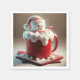 Un gran malvavisco diseñado como un muñeco de nieve con un sombrero de Santa se sienta sobre una taza roja llena de espuma cremosa