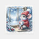 Un ratón acogedor, con un suéter rojo y un gorra, sentado junto a una ventana con espuma, sostiene una taza de cacao caliente mientras admira un paisaje nevado con pinos y copos de nieve