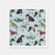 Los Navidades sabrosos Schnauzers con sal y pimienta, y los abrigos negros y plateados llevan sombreros de Santa, corderos y sudaderas de argyle sobre un fondo azul con adornos dispersos.