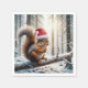 Una ardilla con un sombrero de Santa está colgada en una rama cubierta de nieve en un bosque invernal, con la luz del sol filtrándose a través de los árboles