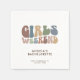 Abraza el espíritu de la máxima escapada de chicas con nuestras servilletas de fin de semana de despedida de soltera con tipografía retro personalizada. Este top chic y elegante sirve como el recuerdo perfecto de un viaje memorable con tus damas favoritas. La parte delantera de la camiseta muestra una tipografía cautivadora de "Fin de semana de chicas" de inspiración vintage que captura perfectamente la diversión y la camaradería de tu fin de semana especial. Su letra juguetonamente girada y colores vibrantes te transportan de vuelta a los días dorados, añadiendo un encanto nostálgico que combina bien con cualquier suministro de fiesta.