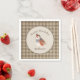 Un pájaro marrón lindo rodeado de una servilleta de cumpleaños personalizada y con toallita de plumas marrones. Qué lindo para el cumpleaños de un niño pequeño.