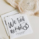 Una divertida y única servilleta con letra manuscrita personalizada específicamente para ti para una fiesta post-nupcial. Cuenta con las palabras "We Tied the Knot" (Nosotros atamos el nudo) con anillos de boda descansando sobre ella. Debajo y encima de esto están los nombres de la novia y el novio y la fecha de compromiso.