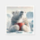 Un oso polar con contenido disfruta de una taza de bebida caliente al vapor envuelto en una acogedora bufanda rodeada de un vasto paisaje helado.