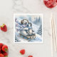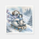 Un oso polar y un pingüino son alegremente dormidos por una colina nevada, envueltos en bufandas y audífonos cómodos