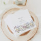 Las servilletas de papel de boda de flores silvestres presentan gráficos de flores silvestres de bonito, una paleta de colores rosa, azul, lila, amarillo y verde suave y un tipo de letra moderno. El diseño es elegante y perfecto para un boda de verano de flores silvestres. Parar con cualquier cosa de la colección ELODIE para tener un aspecto cohesivo.