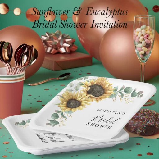 Servilleta de papel floral de eucalipto y girasol con escritura para despedida de soltera que puedes personalizar fácilmente con los detalles de tu fiesta haciendo clic en el botón "Personalizar". Con características florales de color amarillo brillante y suculentas verdes con tipografía moderna