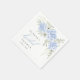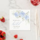 Servilletas elegantes para despedida de soltera con flores, con un arreglo floral delicado de hortensias azules pastel y tipografía elegante.