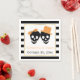 Una divertida pareja de cráneos y una rayada aburrida de rayas blancas y negras son los elementos de esta servilleta de papel boda de Halloween junto con tu texto en blanco. El novio tiene un gorra naranja mientras que la novia lleva una reverencia naranja.