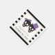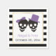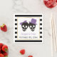 Pareja de cráneos y rayas boda de Halloween púrpura servilleta de papel. Una divertida pareja de cráneos y un borde a rayas hecho de rayas blancas y negras son los elementos principales de este diseño boda de Halloween junto con tu texto en marco blanco. El novio tiene un gorra morado mientras que la novia lleva un arco morado.