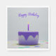 Una torta de cumpleaños personalizado morado con espolvorea en los lados y una vela encendida se sienta en un plato dorado sobre un mostrador cubierto de puntos de colores.