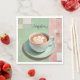 This is a soothing still life painting focused on a cup of coffee with latte art. The cup itself is a pale, mint green or aqua color, resting on a matching saucer, and filled with a rich brown liquid topped with a white, heart-like or tulip design. The background is abstract and divided into large, simplified blocks of color, predominantly pastel shades of mint green and blush pink. These color blocks feature a subtle, painterly texture with visible brushstrokes, giving the scene a soft, almost hazy feel. The composition combines the realistic subject of the coffee cup with a geometric and tonal background, creating a calm and contemplative atmosphere.