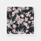 servilletas bodas con un elegante patrón hecho con un ilustracion acuarela de flores rosas con hojas y tallos azul-grises. Un elegante fondo negro.