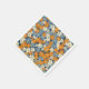 Un patrón floral vibrante cubre toda la imagen. Las flores, pequeñas y estilizadas, en tonos naranja, azul claro y blanco roto, están densamente dispuestas sobre un fondo azul marino. Las flores tienen un aspecto ligeramente imperfecto, de aspecto pintoresco, con variaciones en la saturación de color y en la forma que le dan al patrón un aspecto texturado, casi pintado a mano. El patrón repetido crea un efecto visual alegre y ocupado.