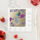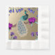 Un pavo real colorido está encaramado en una rama adornada con flores vibrantes. El fondo tiene un tono dorado con detalles texturados, realzando la elegancia general de la escena.