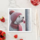 Un perro blanco esponjoso con un gorra y una bufanda con cuchillos rojos tiene la lengua pegada a un poste metalizado helado para Navidades.