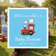 Toallas personalizadas para la ducha de bebé con un lindo tren de choo rojo. Diseño de locomotora de juguete colorido con fecha de nacimiento o celebración. Ilustracion de vehículos para niños adorables. Crea tus propias servilletas de ducha de bebé con texto de personalizable. En tonos rosa pastel, gris azul violeta, etc. Buena idea para la nueva madre, madre para ser. También divertido para los niños fiesta de primer cumpleaños.