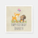 Toallas de papel de cumpleaños con un lindo ilustracion con un ciervo bebé y una ardilla sosteniendo una bellota y una mariposa volando sobre sus cabezas. Estas adorables criaturas de los bosques sobre el césped con algunos hongos extravagantes a sus pies. El fondo tiene una mirada de papel kraft marrón.