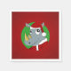 Diseño con ilustracion de cabeza de un rinoceronte lindo sonriente con disfraz de Santa Claus, en círculo verde sobre fondo rojo, diseño de vacaciones para los niños