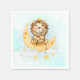 Toallas de papel con un lindo ilustracion acuarela. Un adorable león con una corona pescando estrellas sentadas en una luna creciente descansando en una nube esponjosa. Un montón de estrellas falsas del Relieve metalizado dorado por las nubes le dan a este diseño un toque mágico. Fondo de color azul claro.