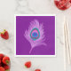 Dibujo vectorial de una pluma de pavo real, realzado y representado en un suave efecto de crayón de conte - pluma de orquídea ligera/violeta, con ojos turquesa, azul cobalto y rosa orquídea profunda, sobre unas servilletas de cena de fondo morado amatista