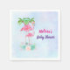 Toallas de papel personalizadas para un evento como una ducha de bebé. Diseñado con el ilustracion de una mami y un flamenco rosado de bebé sobre una cama de flores suculentas florales con palmeras verdes que se balancean por la espalda. Tropical y bonito. El fondo es una acuarela azul veraniego con toques de violeta.