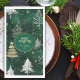 Un diseño elegante con pinos dorados, copos de nieve plateados y ramas sobre un fondo verde cazador y marcos redondos dorados. Puede personalizar esto con sus propios detalles o puede borrar cada texto si no desea que se escriba nada.