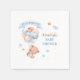 Esta linda servilleta de Baby Shower tiene el tema "Podemos esperar". Cuenta con un suave ilustracion de un feliz oso de peluche flotando con globos. Otros elementos bonitos como las estrellas y un pequeño pájaro completan este diseño acogedor. La paleta de colores azul y marrón es perfecta para una futura madre que espera un bebé.