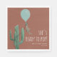 Ilustracion de un globo azul con una cuerda envuelta alrededor de cactus con vegetación botánica sobre cuerda. Antecedentes de terracota y texto en blanco dice, "Está lista para salir"