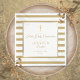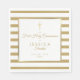 Servilleta de papel a rayas doradas y blancas para Primera Comunión con una cruz dorada y un borde de falso foil dorado que enmarca los detalles del evento en texto moderno. Personaliza con el nombre de tu hijo y fecha especial. Diseñado por Thisisnotme©