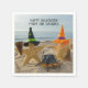 Brujas de pez estrella de Halloween con gorras y escobas en la arena de la playa con olla negra sobre troncos ardientes