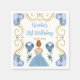 Esta invitación a la servilleta de cumpleaños tiene un marco dorado elegante, una bella princesa con el pelo rojo y un vestido azul polvoriento, flores y un globo. Esto es perfecto para una fiesta de cumpleaños.
